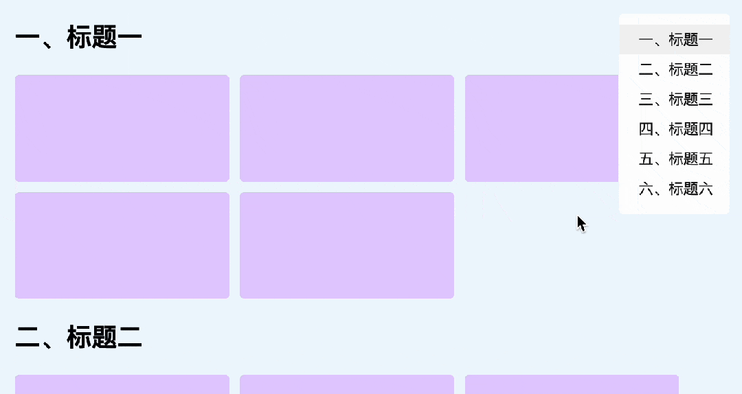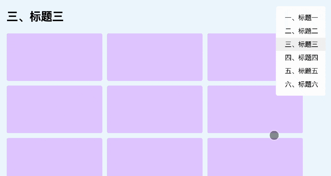 这种导航也被称为“电梯导航”(当然可能还有其他叫法,知道是这个交互就行)。它会随着内容的滚动而自动切换当前选中态,点击任意目录也会自动滚动到对应标题,就像这样