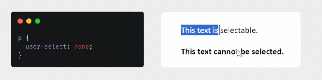 user-select 属性确定元素中文本的可选择性。设置为 none 时,用户无法选择文本。