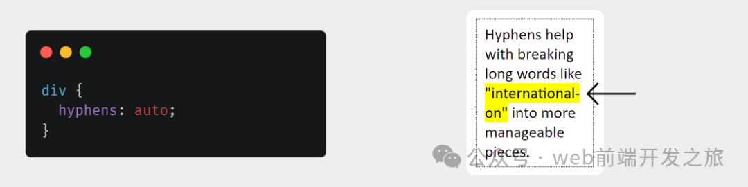 连字符属性会自动在行尾换行长词,以提高文本的可读性。如果单词超过行宽,则会在适当的位置断开并移动到下一行。