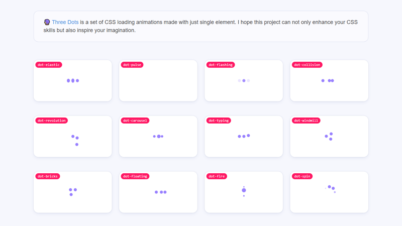 一系列CSS加载动画,例如包括:弧形、基础、弹跳、追逐、颜色范围、色轮、不同方向、点等。